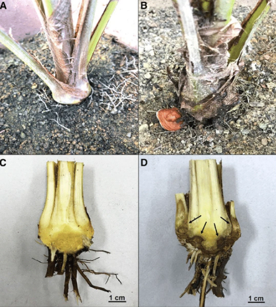 Langkah pertama adalah ketelitian. Pemeriksaan rutin sangat diperlukan agar infeksi bisa terdeteksi sejak dini. Ciri awal ganoderma antara lain munculnya jamur kecil di pangkal batang, pelepah yang menguning atau layu, serta daun yang mulai memudar warnanya.